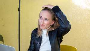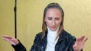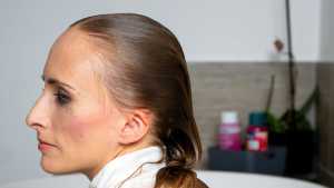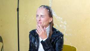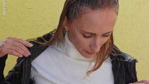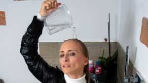 I am happy to introduce a new model. Nika did her first-ever wet or messy shoot for WAM Photography. She gets slowly soaked in the artificial rain, while trying to write an email. She ends up completely submerged in the bathtub. She wears trousers, a black leather jacket and a white turtleneck pullover for this shoot.
